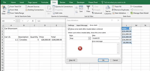 To create an Error Alert go to the Data tab and choose Data Validation. Next click on the Error Alert tab. On this tab you will have a dropdown with three options, Stop, Warning and Information.