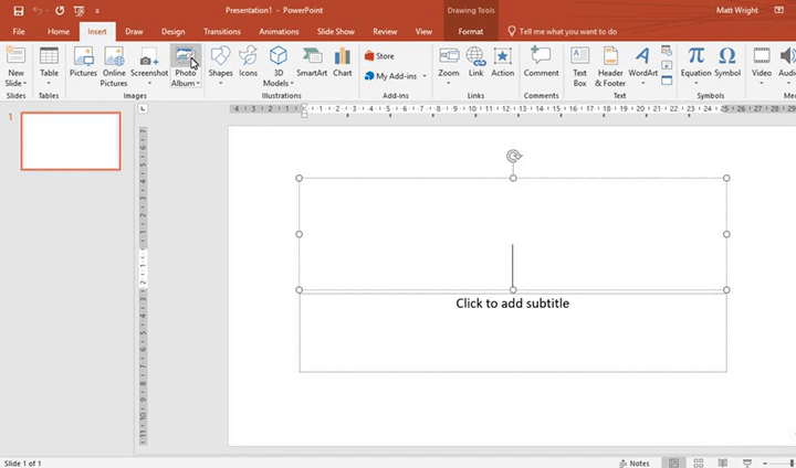 To create a Photo Album, firstly go to the Insert tab and select Photo Album on the Ribbon. This will then open the Photo Album window. Next, select File/Disk… and search your computer for the photos you want to include in your album. Then select them and click Insert. Your images will now be listed in the Photo Album window.