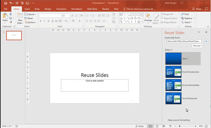 To access the Reuse Slides tool, go to the Home tab and choose the bottom half of the New Slide icon. In the dropdown, click on Reuse Slides. In the Reuse Slides pane on the right-hand side of your screen browse for you presentation that contains the slides you want to reuse. Once you’ve found the correct presentation, select the slides that you want to reuse.